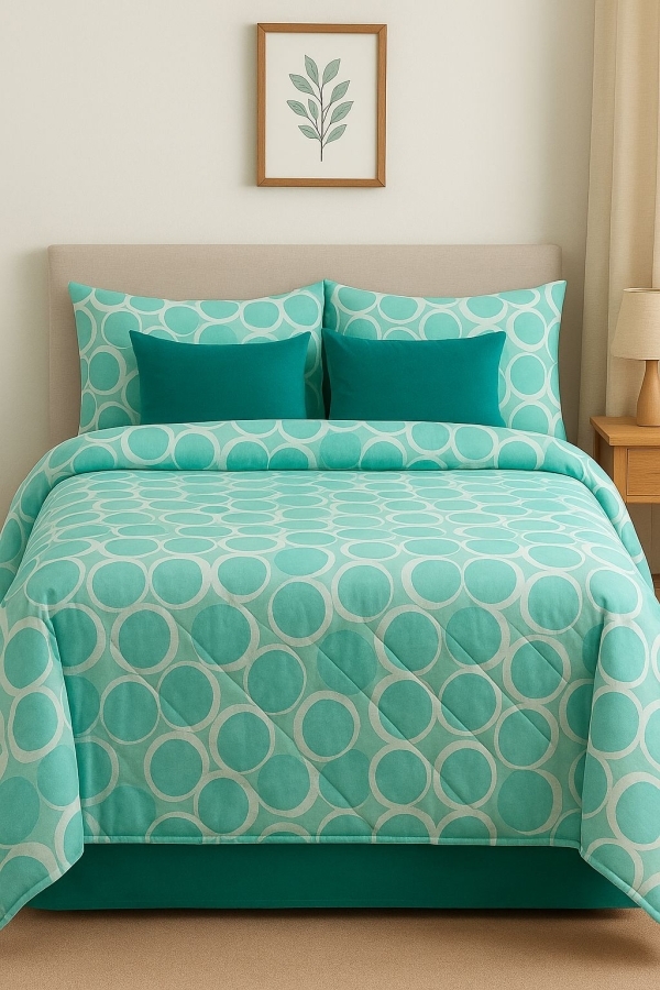 Transforme seu quarto com esse elegante jogo de cama estampado em tom verde-água com círculos brancos. Confeccionado em tecido de malha suave, o conjunto inclui duas fronhas e uma colcha com estampa geométrica moderna e harmoniosa. Ideal para quem busca conforto aliado a um visual clean e sofisticado. Perfeito para camas de casal, o design traz leveza e frescor ao ambiente, com um toque contemporâneo que combina com diversos estilos de decoração.